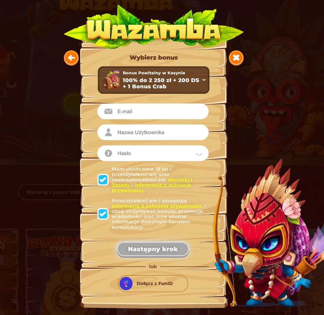 Wazamba PL rejestracja jest dosyć łatwa – chociaż dużym minusem dla nas jest brak opcji rejestracji przez konto Google czy Facebook, co znacznie przyspiesza cały proces.